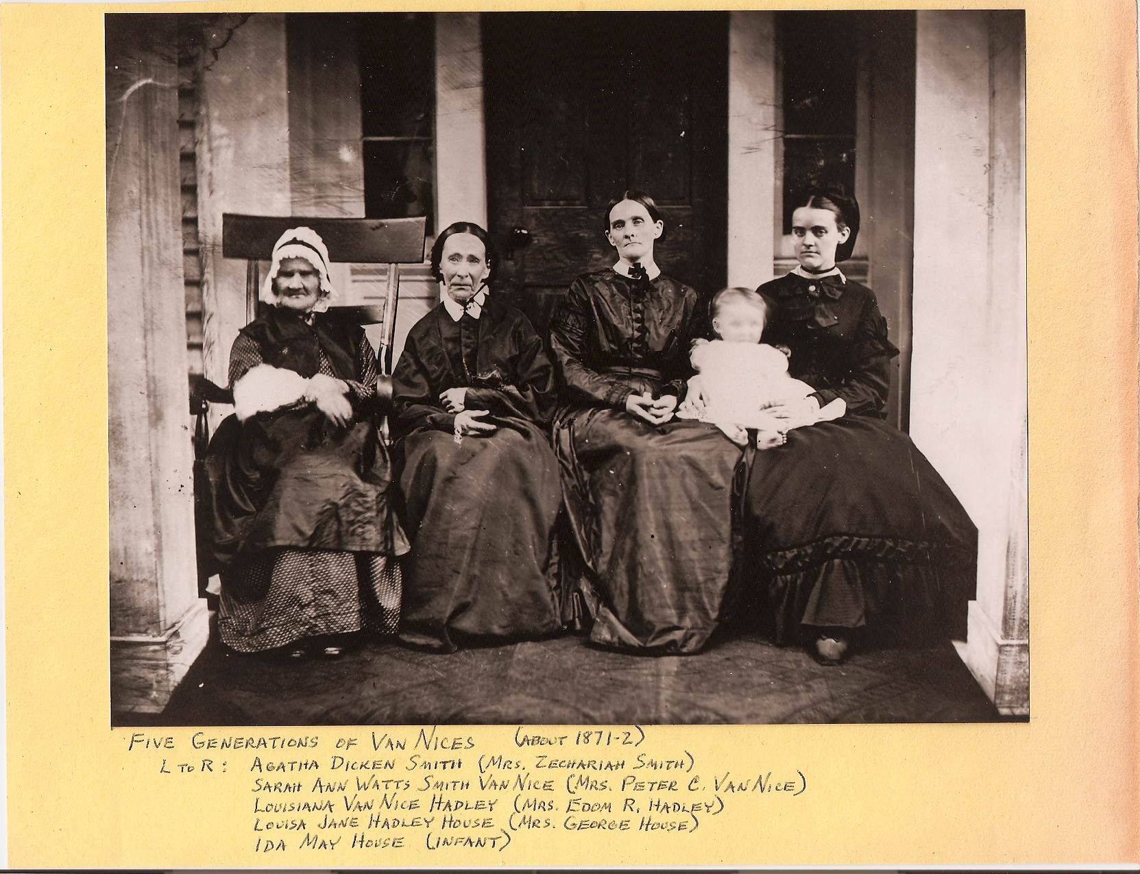 Agatha Dicken Smith, Sarah Ann Watts Smith Van Nice, Louisiana Van Nice Hadley, Louisa Jane Hadley House, Ida May House Photo taken about 1871-72 (Click to view Agathas's Family Card) |