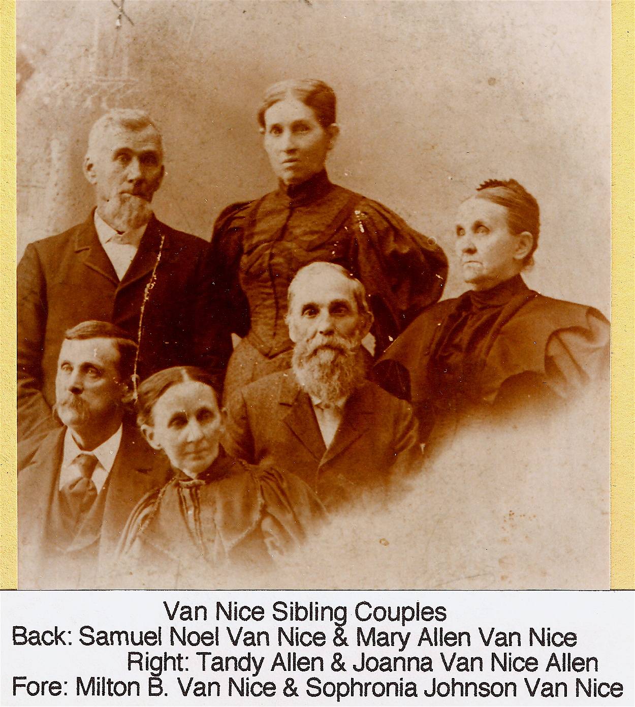 Samual Noel Van Nice and Mary Allen, Tandy Allen and Joanna Van Nice, Milton Van Nice and Sophronia Johnson. Photo taken about 1890. (Click to view Family Card) |